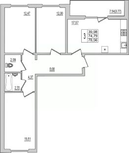 Продаётся 3-комнатная квартира в строящемся доме (Дом 94Д), срок сдачи: III-кв. 2027, общей площадью 77.59 кв.м., на 8 этаже. Новый жилой комплекс ''Семь сезонов'' от застройщика ''ЛУГ''