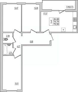 Продаётся 3-комнатная квартира в строящемся доме (Дом 94Д), срок сдачи: III-кв. 2027, общей площадью 77.59 кв.м., на 9 этаже. Новый жилой комплекс ''Семь сезонов'' от застройщика ''ЛУГ''