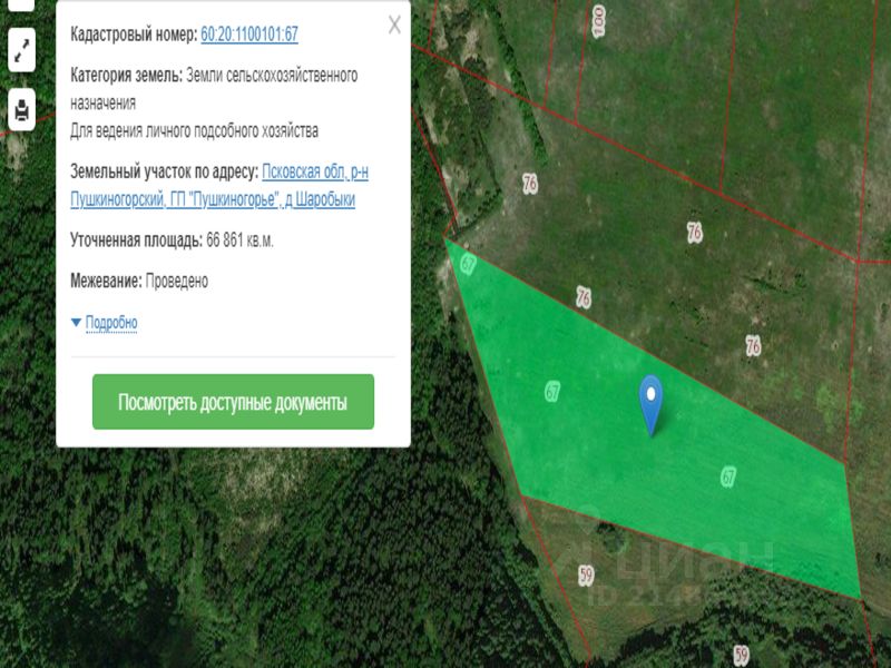 Продам земельный участок, площадью 6,7 га. Кадастровый номер: 60:20:1100101:67 Категория земель: земли сельскохозяйственного назначения. Вид разрешенного использования: для ведения личного подсобного хозяйства. Возможность организации различных форм производствa и выращивания продукции (сады, пасеки, животноводство и т. д.). Адрес: Псковская область, Пушкиногорский район, городское поселение Пушкиногорье, д. Шаробыки. Участок находится в непосредственной близости от Пушкинского заповедника. Рядом с участком усадьбы заповедника: Городище Воронич, усадьба Осиповых, усадьба Тригорское, зооград (огромная территория открытого зоопарка), озеро Каменец, озеро Шаробыкинское, река Сороть.