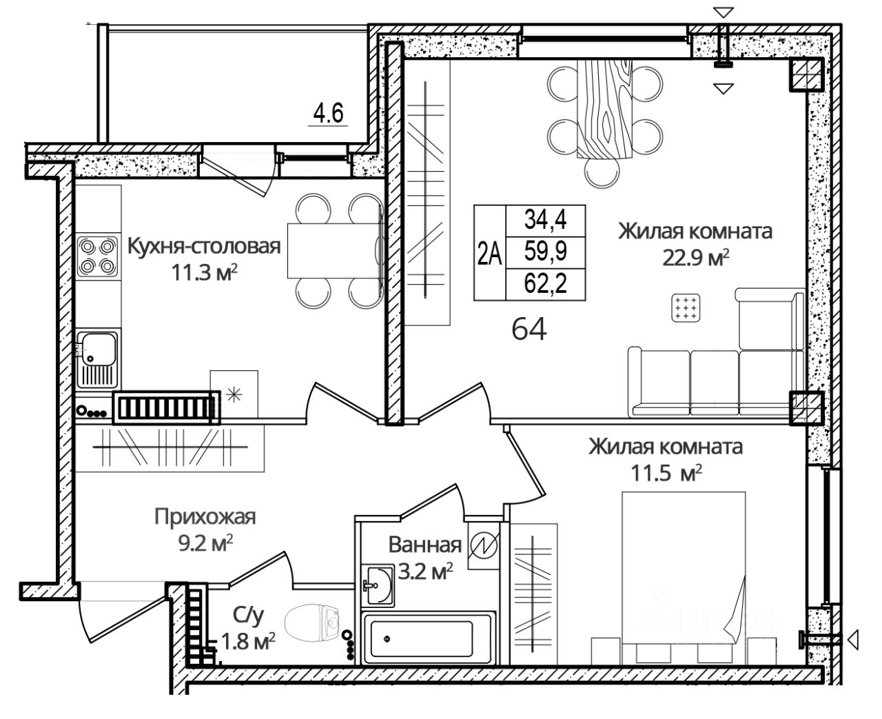 Общая площадь62,2 м2