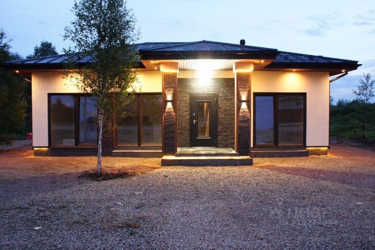 Наружная отделка: Элегантный современный фасад, сочетание декоративной штукатурки и отделки под камень Потолочная и цокольная подсветка, создающая атмосферу уюта в тёмное время суток Качественные панорамные окна и двери с тёмным алюминиевым профилем Удобная входная группа с навесом и декоративной подсветкой