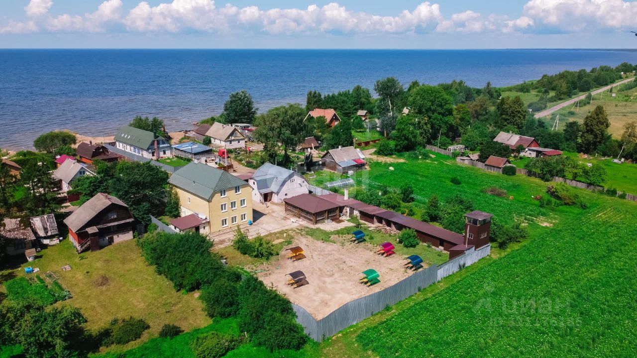 Продаётся трёхэтажный коттедж, расположенный в 6 км от Гдова на побережье Чудского озера. Плoщaдь дома 337,3 кв.м., площадь земельного участка 2460 кв.м. Дoм оснащён всеми удобствами: На первом этаже: кухня-столовая, каминный зал, джакузи, комната охраны, подсобные, кладовые помещения, санузлы. Второй этаж: санузел, подсобные помещения, два номера (один из них с отдельной кухней, санузлом, душевой, 4 спальных места). Третий этаж: 2 больших люкса, один из них с видом на озеро, 4 спальных места, качественный ремонт, возможность любоваться прекрасным закатом, санузел и душевая на этаже, подсобки. Территория с множеством дополнительных построек: баня 106,4кв.м.