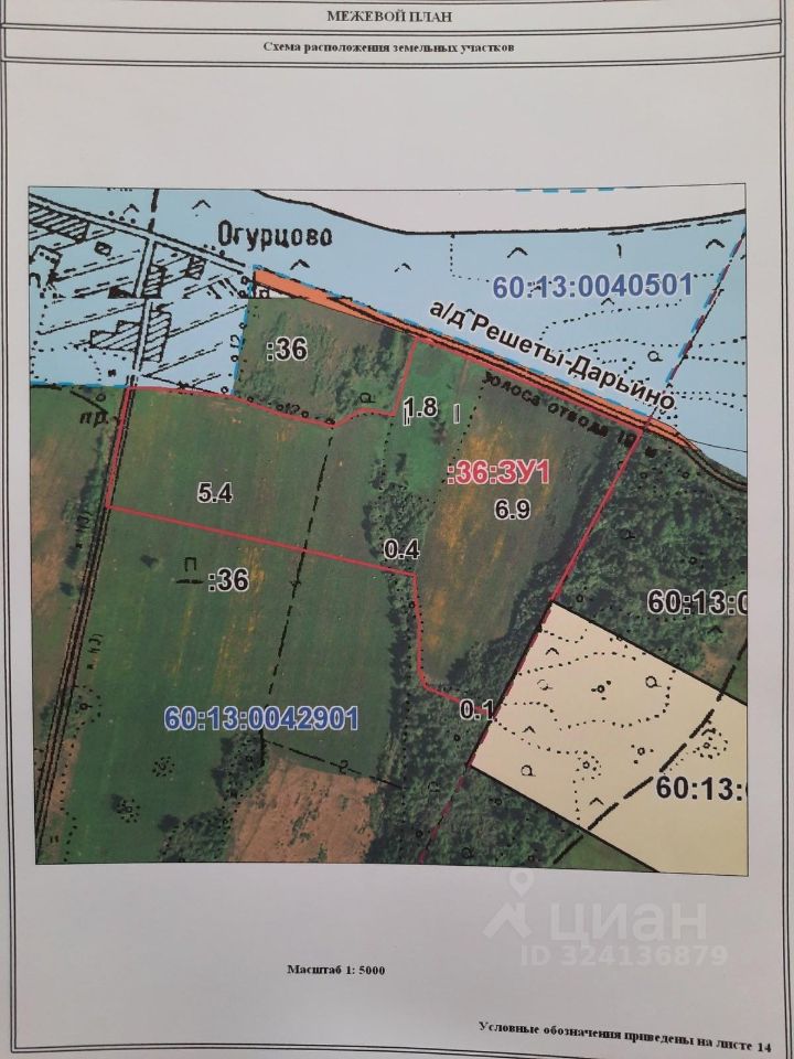 Адрес: Псковская обл., Островский район, д. Огурцово Участок площадью 1 460 соток=14,6га, сельскохозяйственного назначения. Вид разрешенного использования - производство с/х продукции. Кадастровый номер: 60:13:0000000:36 Какие-либо обременения отсутствуют. Преимущества: - вдоль реки Великая, на сухом возвышенном месте, - часть участка граничит с землями ИЖС, - 2 км хорошей дороги от трассы федерального значения (Е-95, Киевская). Варианты использования земли: - использование по назначению в производстве с/х продукции+ построении ангаров для хранения необходимой для работы спец.техники и т.п. , - перевод в земли ИЖС и построение собственной усадьбы и многие другие варианты, предварительно проанализированные А так же возможность рассмотрения изменения вида разрешенного использования, согласно необходимой идеи. Расстояния от участка к другим населенным пунктам/достропримечательностям: - до г. Пушкинские горы - 37, 1 км ( музей- заповедник им. А.С. Пушкина) - до г. Остров (районный центр) - 24 км. (цепные мосты 1853г) - до озеро Гороховое — 20 км. (спортивно-оздоровительный цент ''Юность'') - до г. Псков (областной центр) - 76 км. - до г. Изборск - 80 км. (музей-заповедник) - до г. Печеры - 100 км. (Псково-Печерский Свято-Успенский православный мужской монастырь) - до Хилово - 130 км. (один из лидирующих семейных санаториев Северо-Запада России, основанный в 1865г. на базе источников минеральных вод) - до Ореховно — 135 км (первый и единственный европейский сад в России — Усадьба Ореховно)