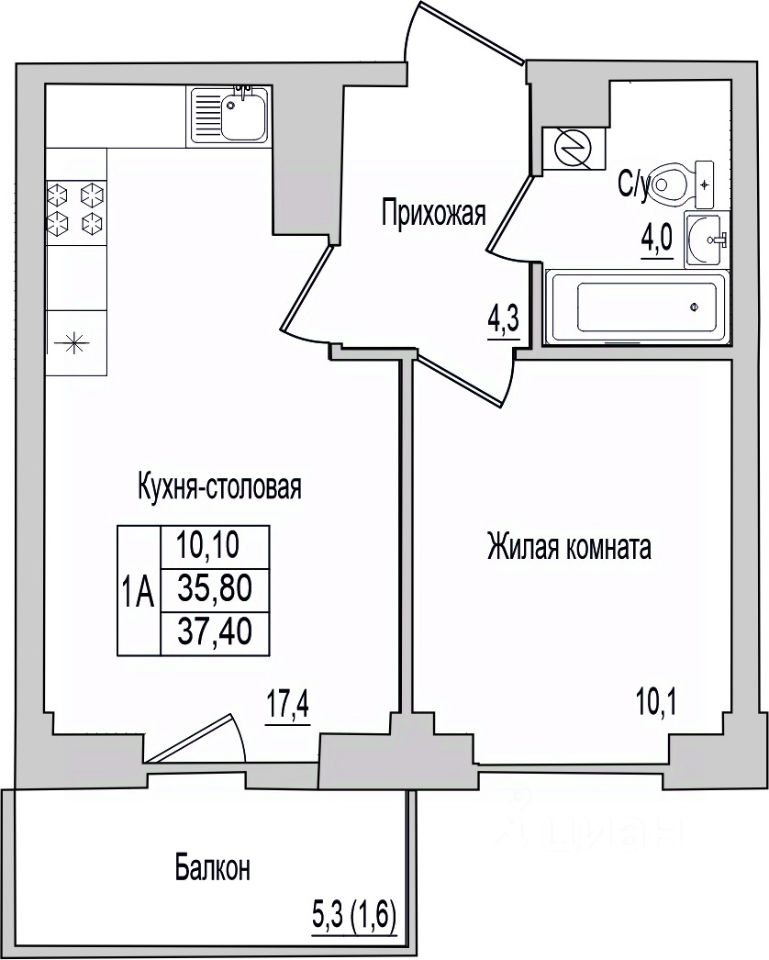 Общая площадь37,4 м2