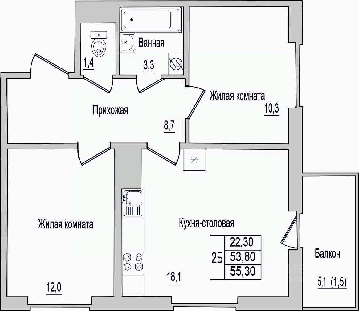 Общая площадь55,3 м2