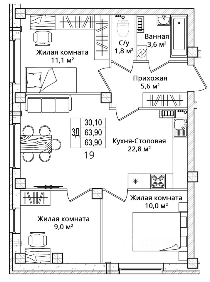 Общая площадь63,9 м2