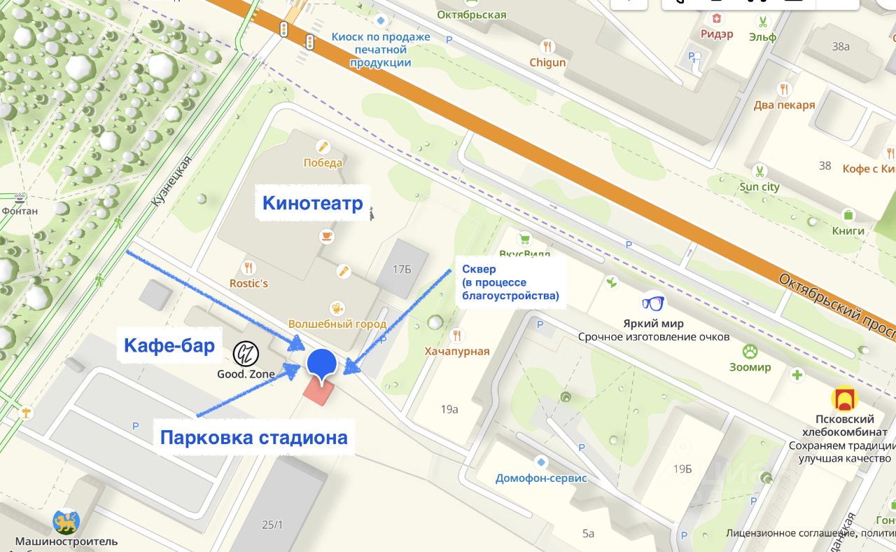 Земельный участок 81м2 (60:27:0020201:419). Разрешено использование под гостиницы, общепит, развлекательные заведения. Градостроительный план на руках.