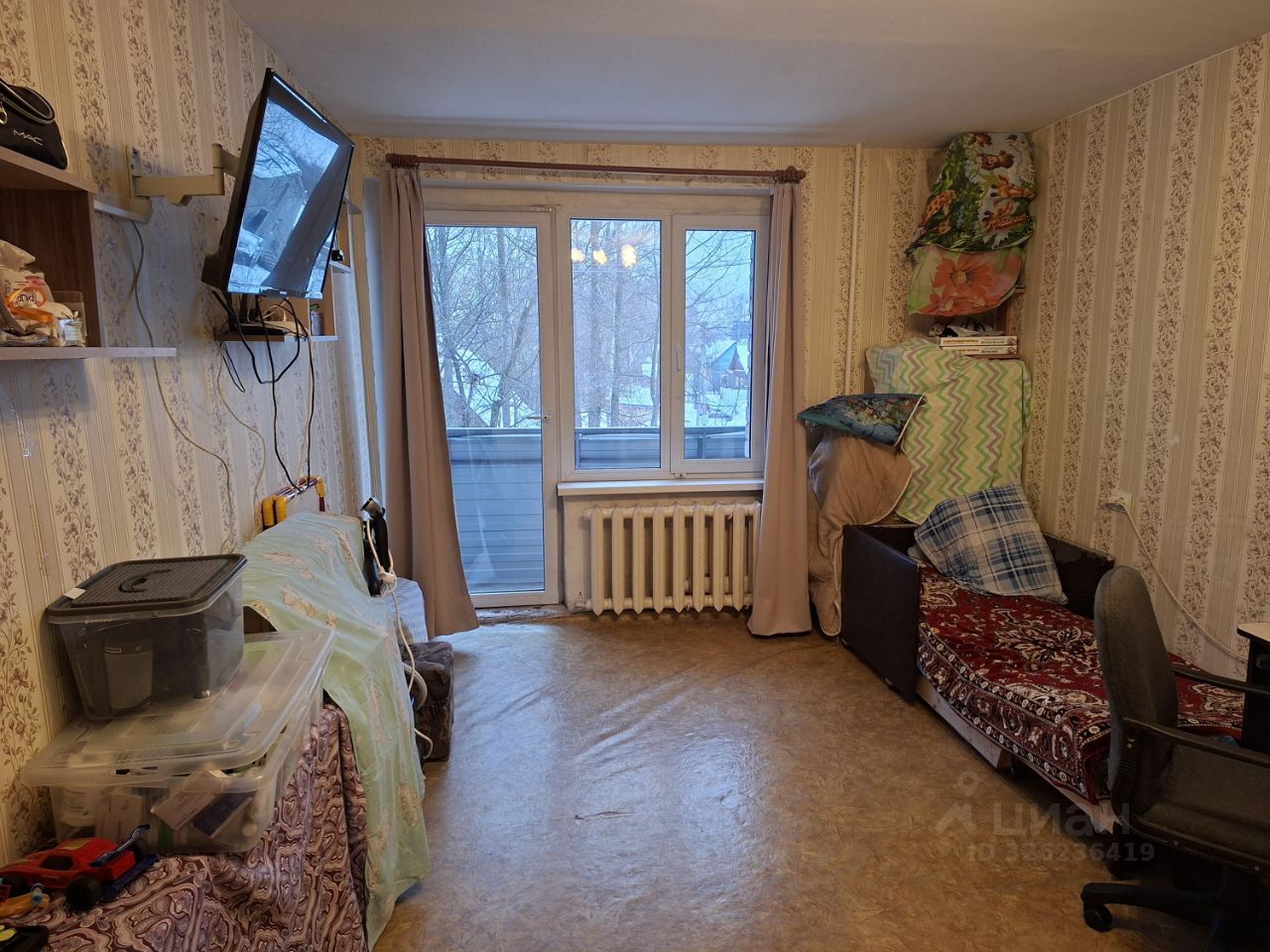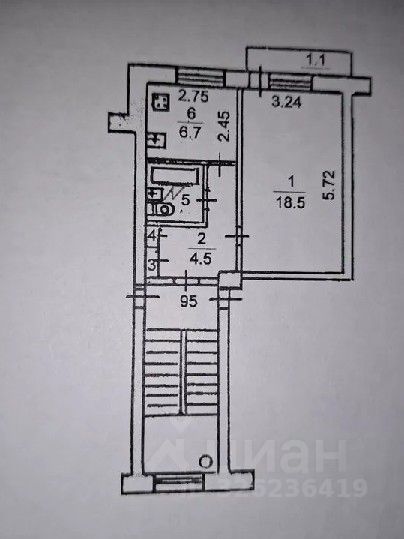 Общая площадь 33,6 м кв, кухня 6,7 м кв, комната 18,5 м кв, с/у совмещён, есть просторный балкон.