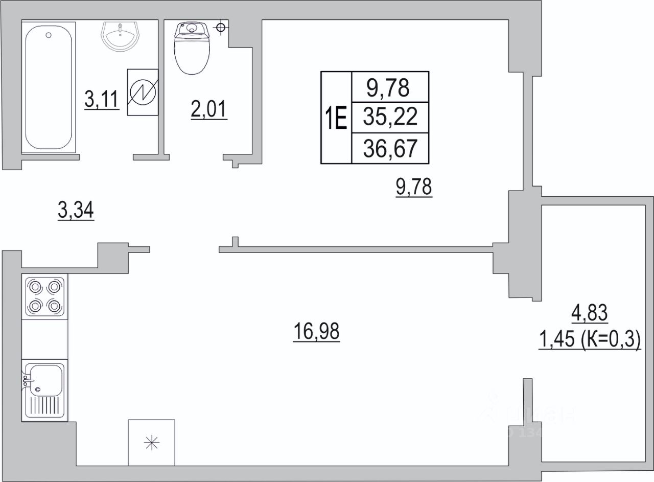 Общая площадь36,67 м2